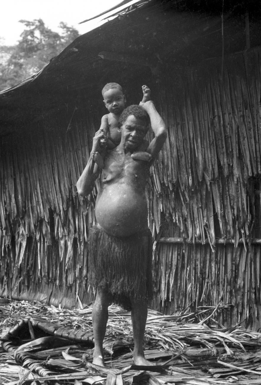 Portret van oudere Papoea-vrouw met kind op haar schouders