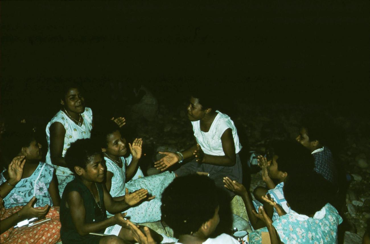 Onderwijzeressen en vrouwelijke leerlingen zingen.