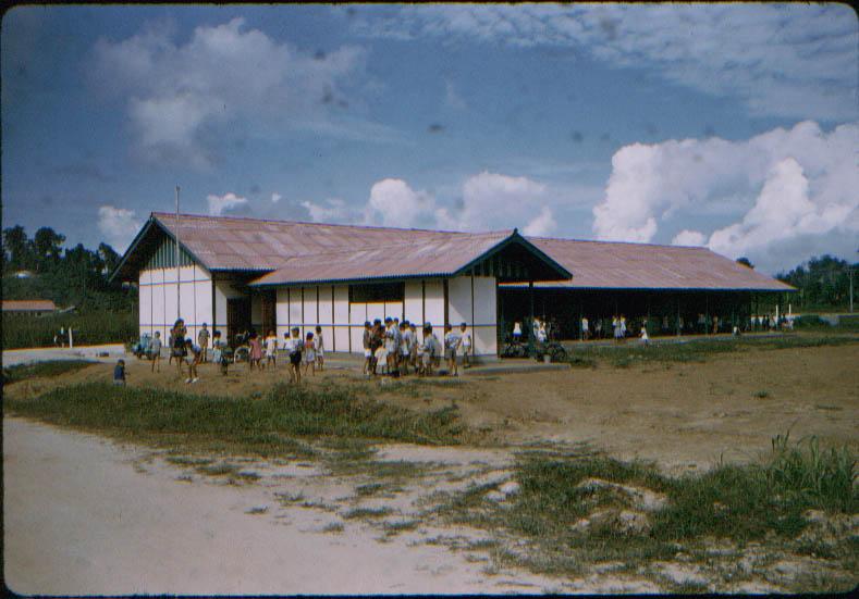 Koloniale nederzetting - Twee schoolgebouwen in L vorm waar kinderen buiten spelen
