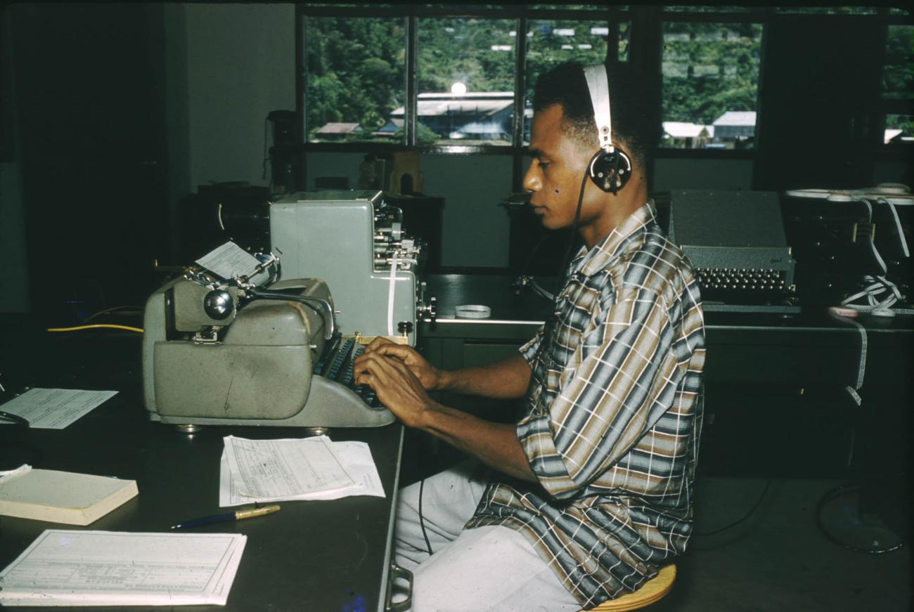 Koloniale nederzetting - Typende kantoorbediende (telex) met koptelefoon