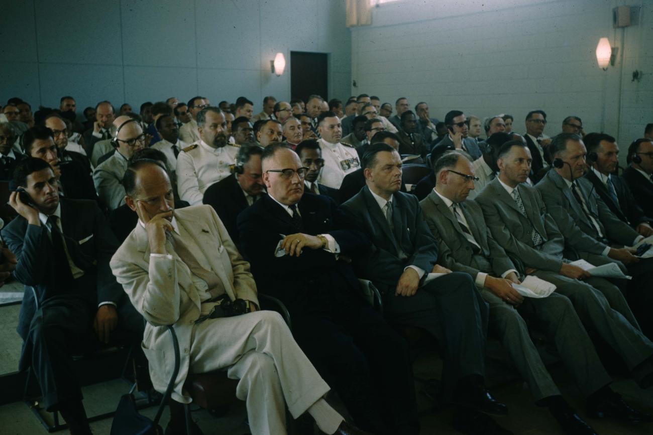 Verkiezingen Nieuw Guinea Raad - Aanwezigen luisteren naar toespraken in de grote zaal