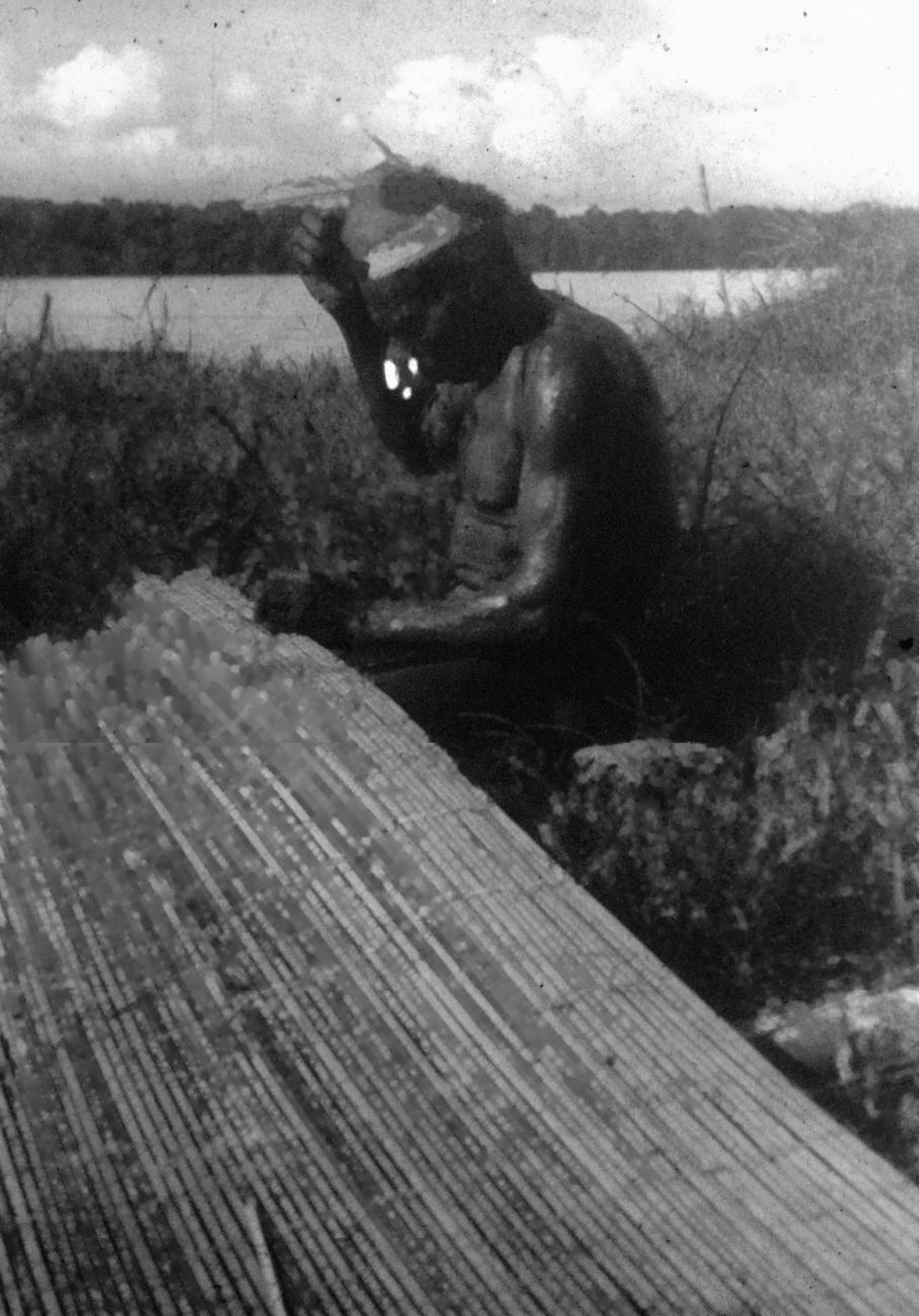 Man met koeskoesmuts en neusversiering bindt een vloermat van bamboe