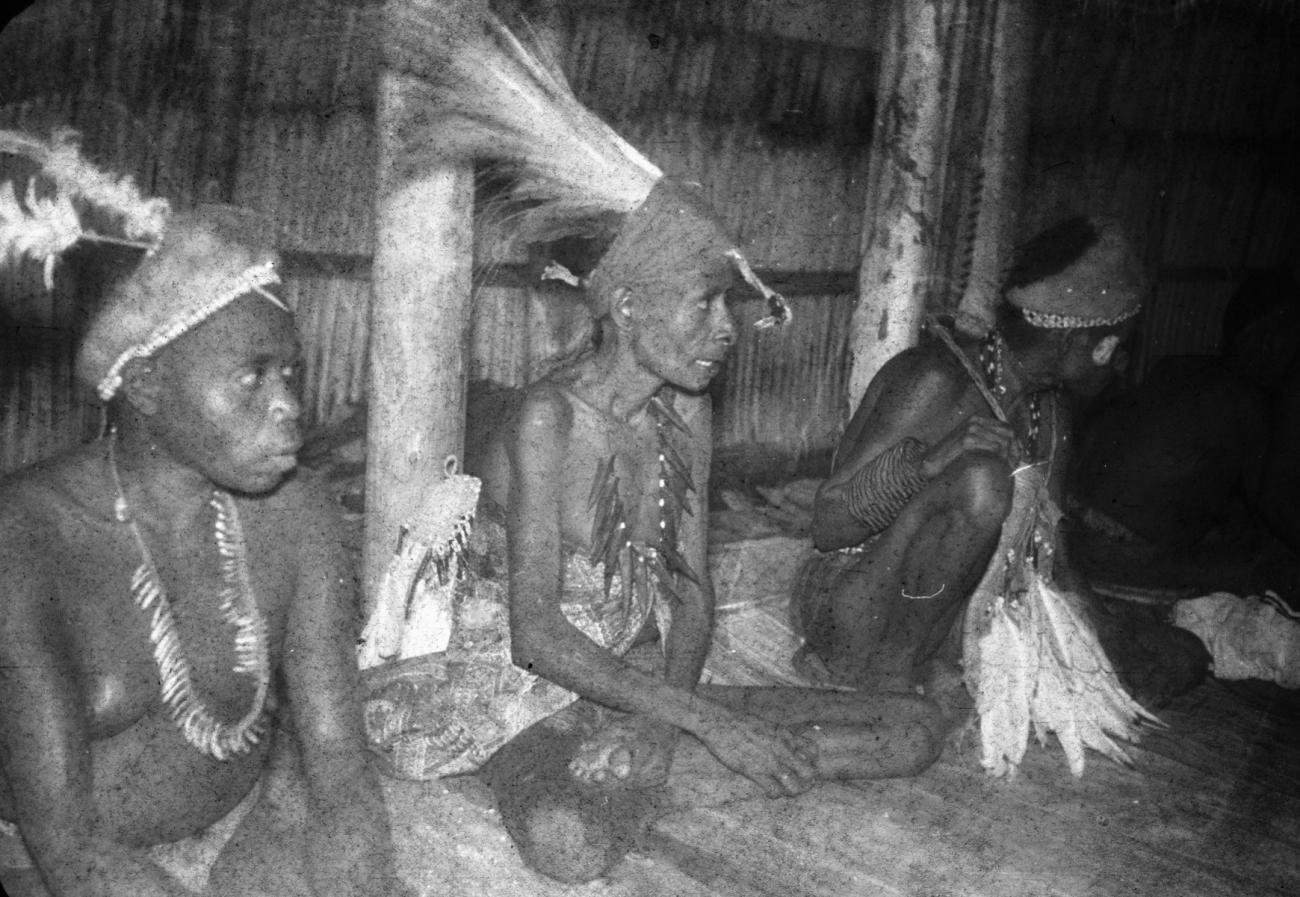 Drie vrouwen uit de Asmat met hoofdtooi, kettingen en rituele dansstok