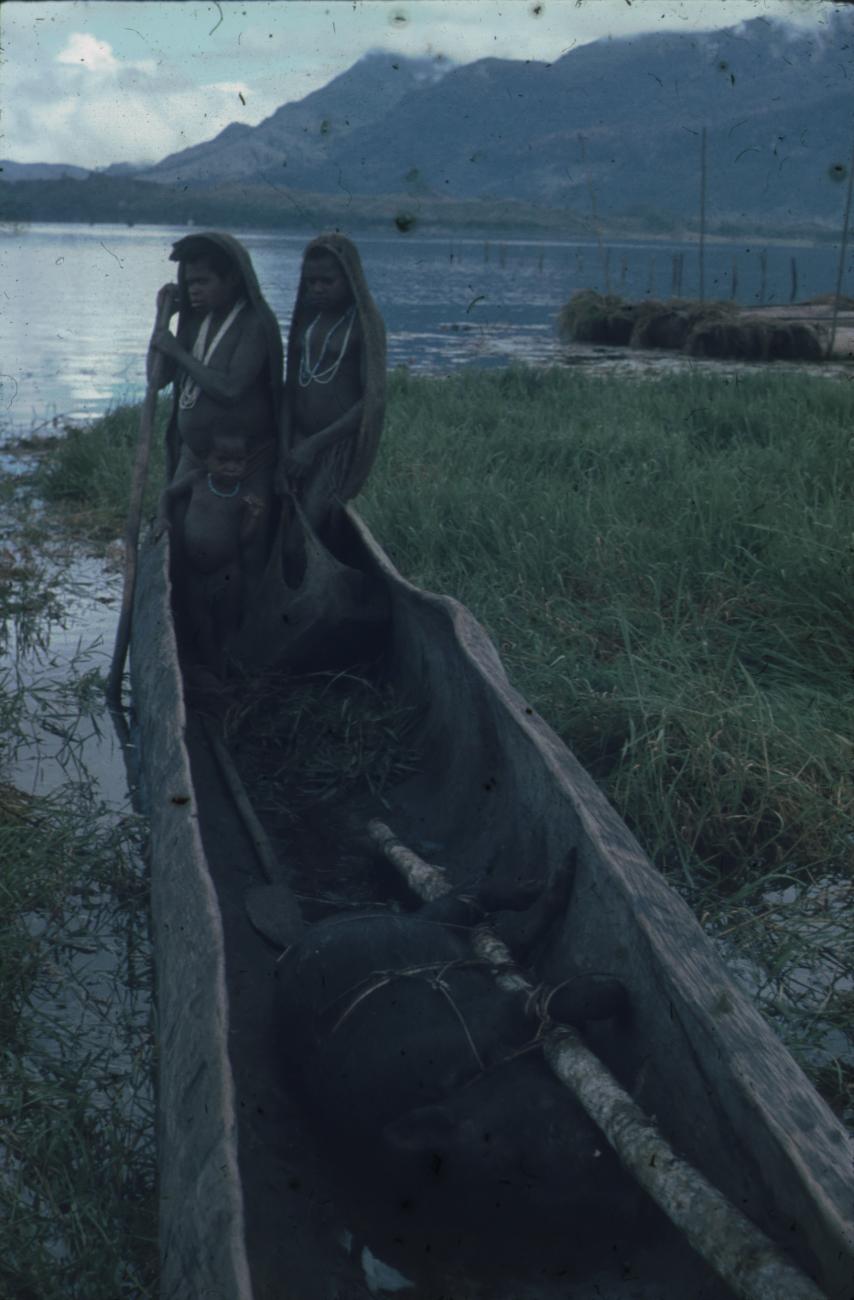 Prauw met twee Berglandbewoners aan de oever