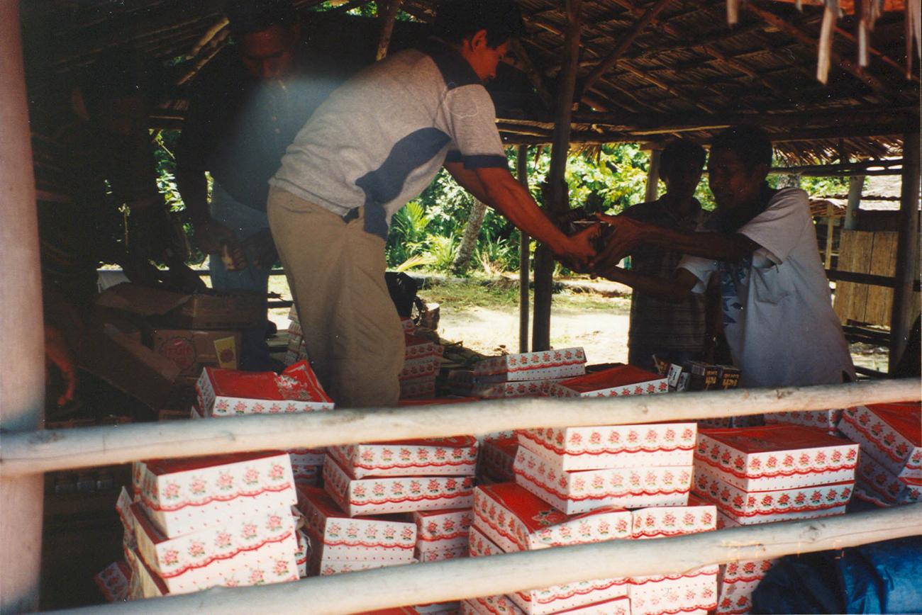 Mensen die waarschijnlijk dozen met eten uitdelen Objectcode BD/269/1089 Personen Blom, H.F. (Maker) Terug naar overzicht
