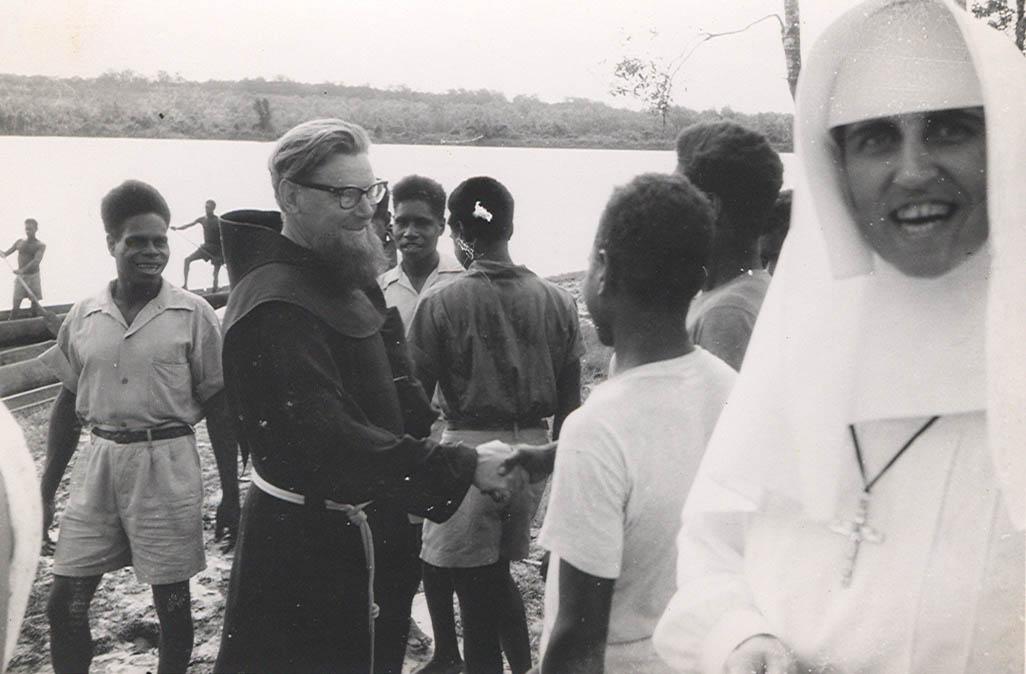 papoea,franciscaan,zuster Clarissen, [Achterop foto: "[man] die achter broeder Manuel staat te lachen, is een goede timmerman na 4 jaar op de T.Y. (?) geweest te zijn"]