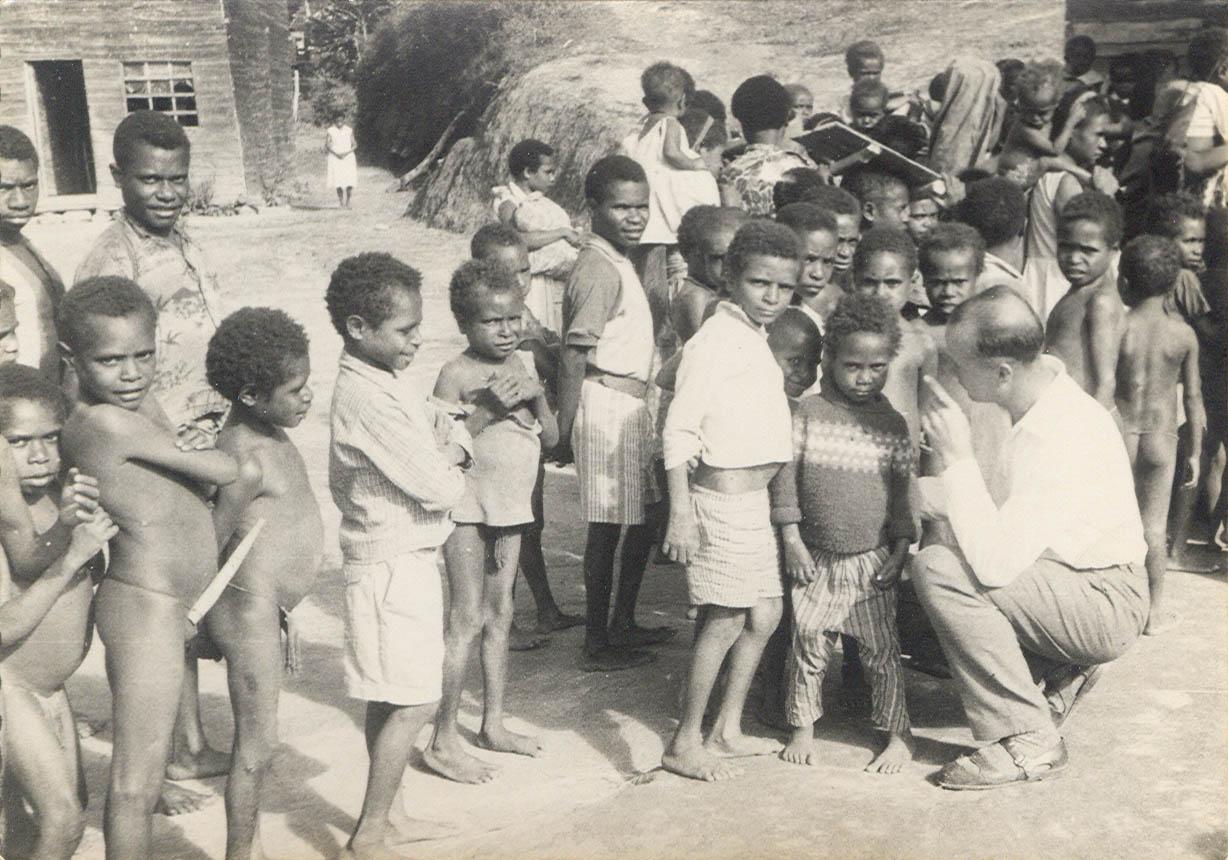Franciskaner broeder Henk Blom met groep Papoea-kinderen in de Baliem-vallei