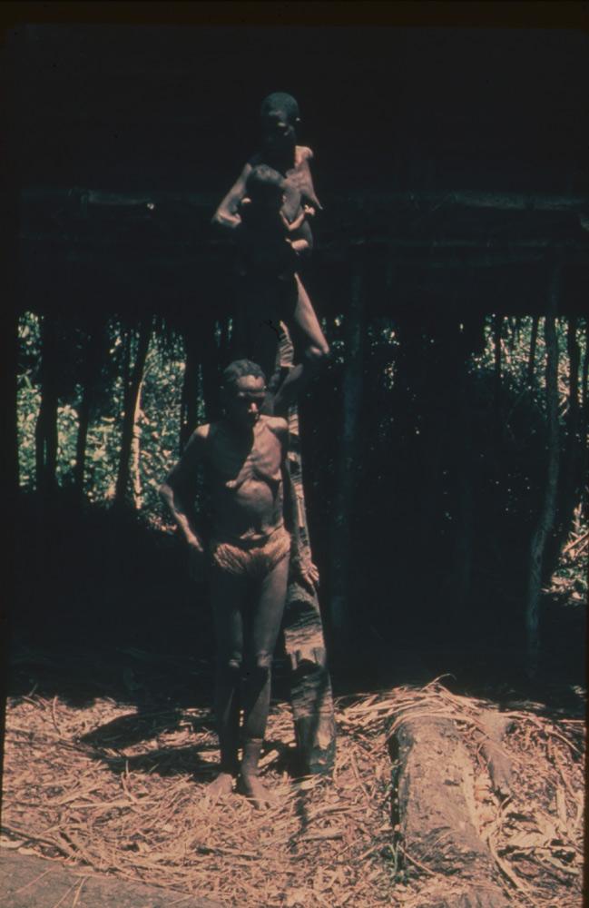 Twee vrouwen en kind verlaten een paalwoning via trap