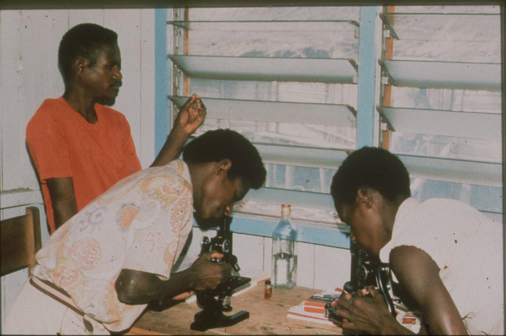 Asmatman en vrouw kijken door microscopen op dokterspost