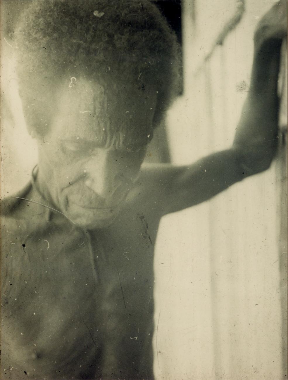 Dorp Sisir, man kijkt toe terwijl meisje been met aandoening toont