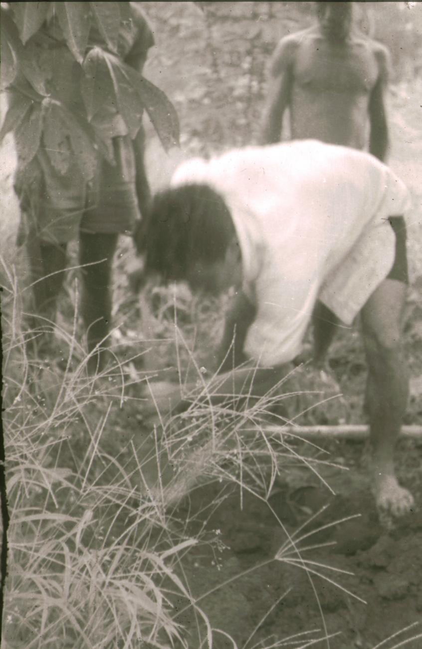 Goten worden gegraven voor het bevloeien van de cacaoplantage