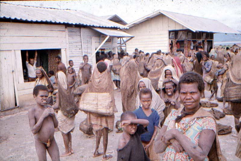 Het kan overdreven zijn, maar hier nogmaals een indruk van activiteiten, ditmaal in de buurt van een paar "winkeltjes", vermoedelijk opgezet door Makassaren - dus bewoners van het eiland Celebes - tegenwoordig genoemd: Sulawesi. Deze lui komen vaak met niets in Irian, beginnen als straatverkopers, en verstaan de kunst zich steeds meer in de kleine handel in te dringen. Vaak proberen ze de mensen af te zetten.