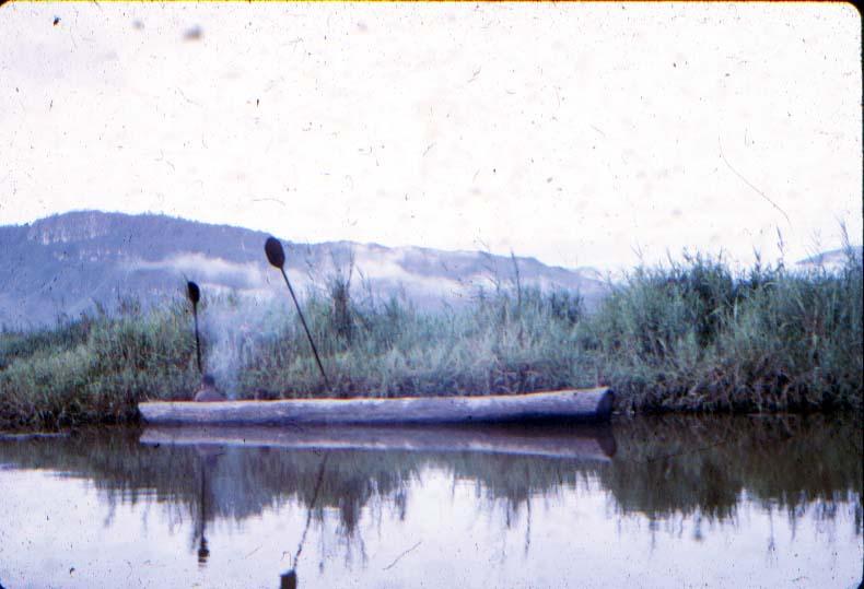 Een vredig morgenbeeld op de rivier Komopa. Men kan zien, dat er een vuurtje aan boord is.