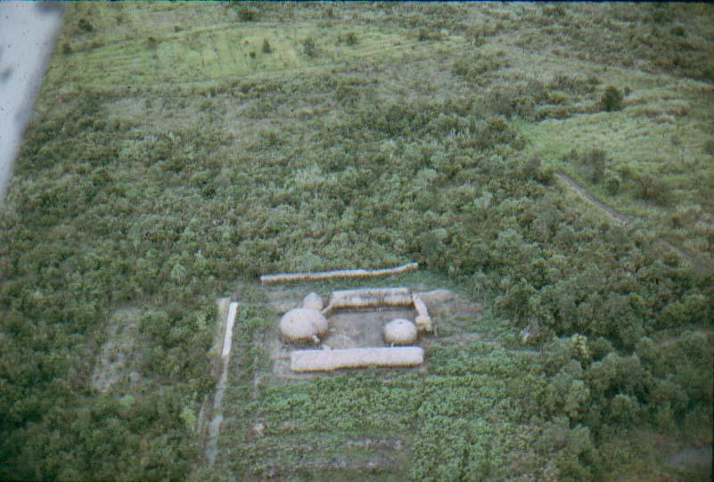 Commentaar maker foto: nog een opname van een kampong in de Baliem, waarschijnlijk een jong stelletje, waarvan de man nog maar een vrouw heeft. We spreken gemakkelijk over "kampong-dorp", maar eigenlijk is dit minder juist. Het zijn meer familie eenheden.
