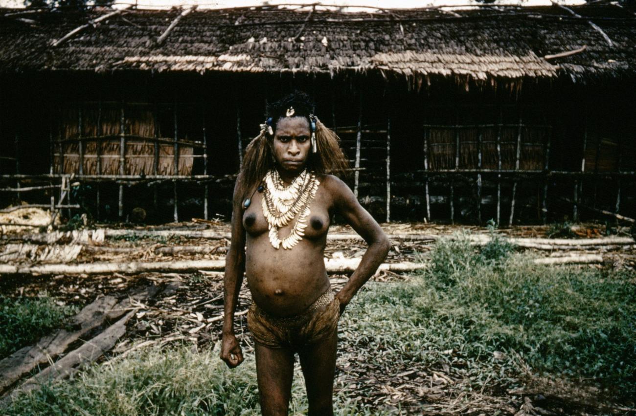 Asmat, vrouw, halsversiering, neusversiering, haarverlengsel, blauw, kraal, glas