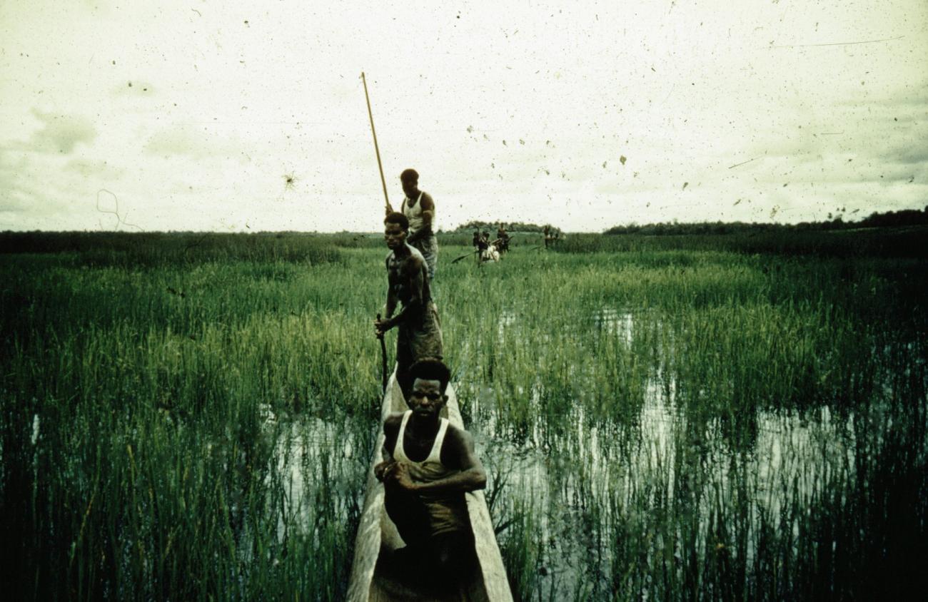 Mannen in prauw in moerasgebied in Zuid Nieuw Guinea