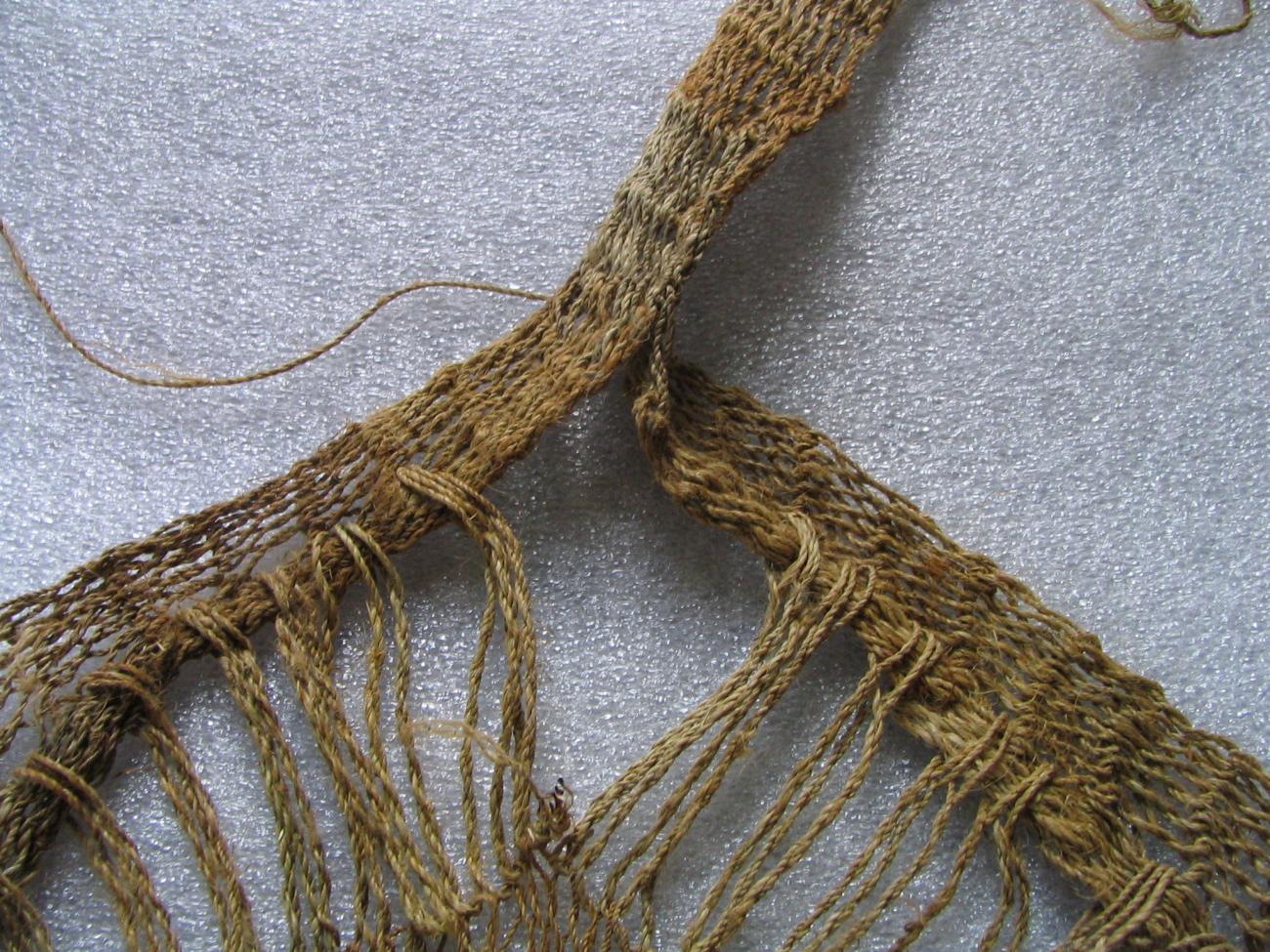 De rand (2 cm) en draagband zijn apart van de grote vorm gemaakt en later zijn die aan elkaar gezet met een siersteek die bestaat uit een lange verbindingslus waarvan de twee draden tussen de rand en de grote vorm 8 tot 10 keer om elkaar zijn gedraaid. De grote vorm is in zandloperlussen (figure eight looping) die verschillen van grootte. Er is waarschijnlijk niet met een maatreep gewerkt. Er is onderaan om een hulpdraad begonnen en in het rond gewerkt tot de gewenste lengte. De onderkant is dichtgemaakt met een sierlussteek. De rand en band zijn ook in zandloperlussen en volgens een bijzonder patroon gevormd. Waarschijnlijk is het midden van de draagband het begin.