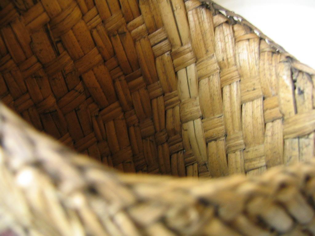 Een kleine tas voor persoonlijke bezittingen. De tas heeft een deksel dat over het onderste deel heen geschoven kan worden langs een draagkoord. De tas is gevlochten in kepervlechtwerk van biezen. De biezen zijn gedeeltelijk geverfd zo dat schuine strepen ontstaan. Het deksel en het tasgedeelte zijn beide versierd met een figuurtje van drie kaurischelpen.