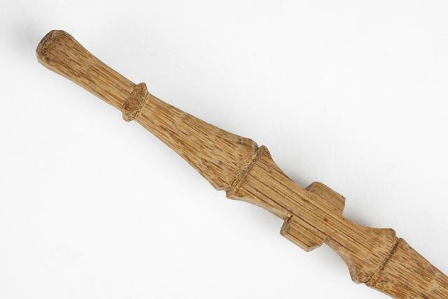 Het kamgedeelte is gemaakt door het bamboe te spitsen in 5 tanden.Tussen deze tanden zijn aan de kant van de steel plugjes tussen de tanden gestopt om ze open te houden. Vlak daarboven zijn geven kleurverschil aan dat er draad omheen heeft gezeten. Dat stevig omwonden werd om uitscheuren te voorkomen.