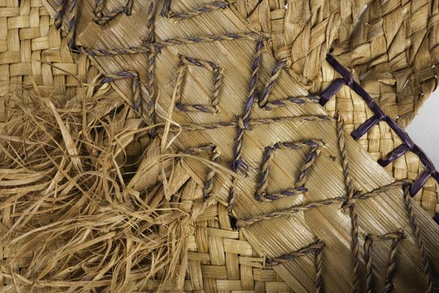 Smalle repen: Van boven naar beneden:1 over 1( 3,5 cm.)1 over 2, onder2, over 2,onder 1, over 1, onder1, over 1, onder 2 ,over 2( 5,5 cm). Dan1 over1, onder 1, etc.(6,5 cm.) Weer 1 over 2, onder 2,over2, etc. ( rest van de tas. Bovenaan een boord van breed pandanblad (ca.4 cm. breed) op de tas genaaid met Gnetum gnemonvezeltouw.Twee verschillend gekeurde drade (blauw en naturel) zijn om elkaar heengedraaid voor de vorming van he koord Maten: hele tas-dubbelgevouwen- hoogte:26 cm. Pandanboord op 1 cm. van de bovenrand. Hengsel: 63 cm. lang. UIit 4 vlechtjes samengesteld. Iedere vlecht loopt uit in een kwast van 4,5 cm lengte. Onder boord steekt 1,5 cm. van de vlechten uit. De vlechten zijn in het handvat dwars verbonden, doordat sommige repen doorlopen in de volgende vlecht. Dat gebeurt om en om. Eén reep loopt door, de volgende reepwordt omgevouwen en blijft in dezelfde vlecht.. Bovenkant boord is omgefestoneerd. De tas is rondom gevlochten en eindigt aan de bovenkant onder de festoneerrand. Het hengsel is no met een aantal dwarssteken vastgezet op de rand. Ook midden onder in de bodem zijn wat minderingen aangebracht.