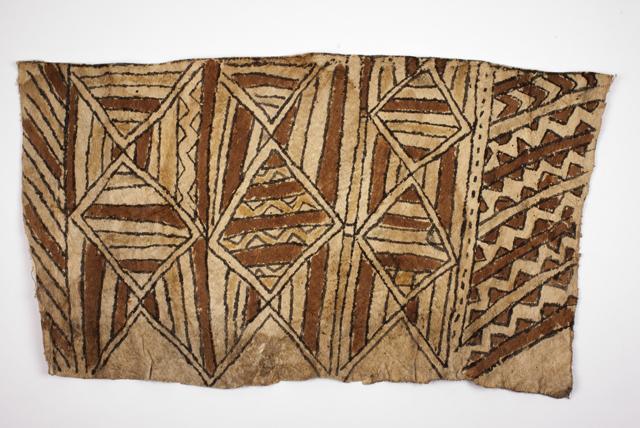 Doek van geklopte boombast en versierd met bruin, zwart en lichtbruin geschilderde motieven.