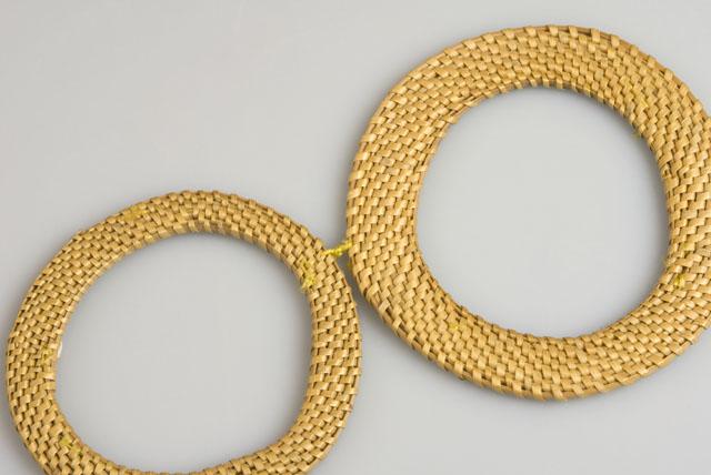 Wandversiering bestaande uit drie ringvormige onderdelen met een opening in het midden. Een lichtbruine ondergrond als kleur. Het bindwerk van de bovenste ring is versierd met vlechtwerk in de kleuren geel en donkerbruin. Doorsnede bovenste ring is 12 cm, doorsnede middenste ring is 10 cm, doorsnede onderste ring is 9 cm.