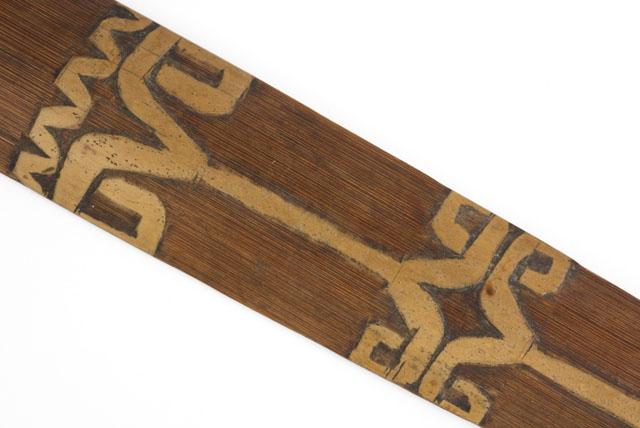 Relatief kleine boog, vervaardigd uit palmhout en donker van kleur. De pees ontbreekt. Op de boog zijn figuurtjes ingesneden. De boog is versierd met ringen van van bastvezeldraad