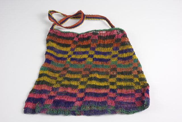 Gekleurd nettasje in felle kleuren vermoedelijk vervaardigd uit katoenen vezels.