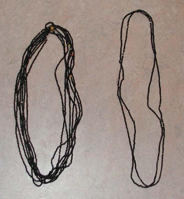 Twee kettingen vervaardigd van vruchtenzaden en enkele kralen, gedragen door vrouwen .