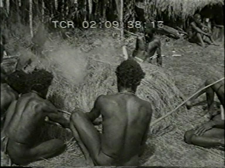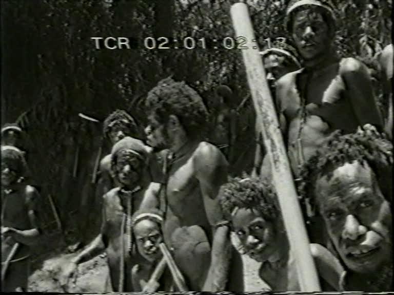 Beschrijving (bron: www.beeldengeluid.nl) SHOTS: Luchtopnamen van oerwoud waardoor zich de Baliemrivier meandert en van de Baliemvallei met talloze tuinen. Twee Amerikaanse zendelingen die motorbootje aan rivieroever gereedmaken waarbij menigte Dani's toekijkt. Snelstromende Baliemrivier waarover hangbrug gespannen is, belopen door valleibewoners. 01.40 Zendeling gaat hutten langs waaruit bewoners en varken te voorschijn komen en hem hartelijk begroeten. 02.33 Zendeling dient kinderen in de bil injectie met penicilline toe. Vrouw van de zendeling doet, geholpen door Dani's, de was in lege oliedrum, die ingenieus tot wasmachine getransformeerd is waarbij haar kindertjes op de schouders van Dani's toekijken. 03.12 Zendeling omringd door Dani's toont bijbelplaten en geeft uitleg bij de voorstellingen. Zendeling gebruikt bij studie van de taal bandopnameapparaat en laat een oude en een jonge Dani woorden in microfoon spreken ter samenstelling van een woordenboek. 04.15 Ommuurde tuinen van de valleibewoners met stenen wallen als afscheiding. Kind wiedt met de hand een tuin. Cameraschuwe vrouwen met hoofdnetten zetten het op een lopen uit vrees voor het 'magisch oog' . Jongens bekwamen zich in de jacht door als speren gebruikte stokken door een opgegooide hoepel te werpen. Man vlecht van gras eenvoudige bovenarmversiering. 05.30 Bij hut rondscharrelende varkens, een bijzonder bezit. Leden van bevriende stam komen aan bij het dorp, waarvan de bewoners hopen gras bijeenbrengen, zich met roet en varkensvet opmaken, met stenen bijlen houten palen t.b.v. brandhout kloven. Met gepunte stok wordt aarde open gebroken en de kluiten met de hand verwijderd zodat ondiepe kuil ontstaat. 06.40 Opbouw op onderlaag van stenen van een rechthoekige brandstapel die wordt aangestoken waardoor steenbrokken op de brandstapel worden verhit. Man laat zich door helper opmaken, Dani demonstreert werking van mondharp, die in de neus wordt meegedragen. 07.13 Varken wordt opgedreven en aan de voornaamste gasten getoond. Hoofdman van de ontvangende stam doodt met pijl en boog door stamgenoten omhoog gehouden big en vervolgens een varken. Viertal gedode varkens wachtend op behandeling. Op separate brandstapel worden de haren weggeschroeid waarna de opperhuid met bamboemessen wordt afgeschraapt en het dier met vlijmscherpe bamboemesjes ontleed. Een mondharpspeler. 08.31 Met gevorkte stokken worden de op de brandstapel verhitte stenen opgepakt om de met stro bedekte wanden en vloer van de braadkuil te bekleden. Het vlees en wat groenten worden op de stenen gespreid, het geheel met gras bedekt en rondom met buigzame stokken vastgesnoerd. 09.43 Lap gebraden vlees wordt uit de kuil getild. Gebraden lappen vlees klaar voor verdeling. In kring gezeten mannen doen zich tegoed aan de feestmaaltijd. Gezin van zendeling woont feestmaaltijd bij. 10.25 Eénmotorig vliegtuigje stijgt op van de airstrip. Luchtopnamen van de door krans van wolken omgeven bergtoppen en van meanderende Baliemrivier. EINDE.