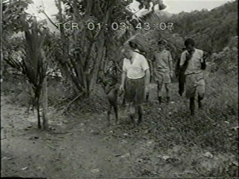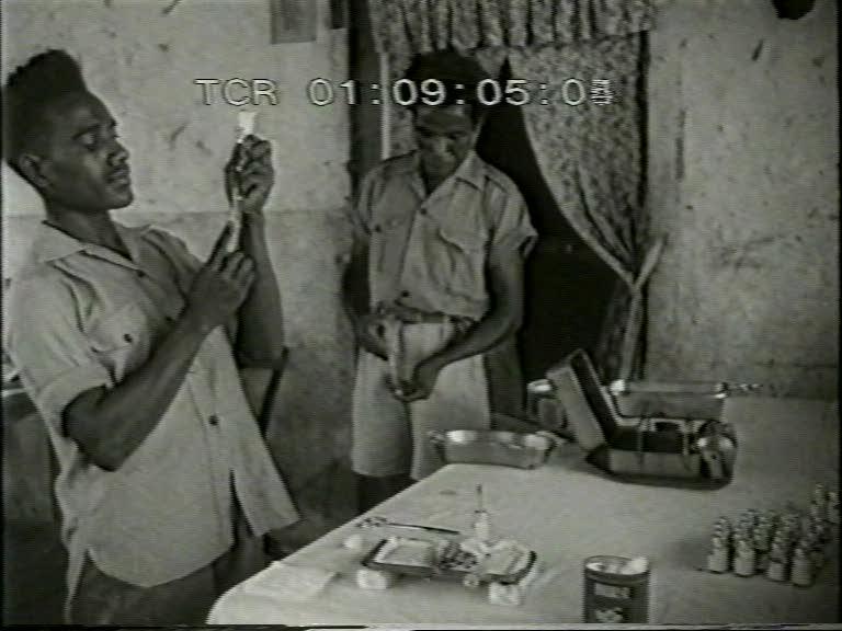Beschrijving (bron: www.beeldengeluid.nl) 00.22 SHOTS: Papoea gooit scheepstrossen los van de steiger waarop belangstellenden op dienstreis vertrekkend resident, afdelingscommandant van de Algemene Politie, dokter met kleine staf en ambtenaren uitwuiven. (Passage van Humboldtbaai waarop twee zeiljachten. Opvarenden aan dek in gesprek tijdens de vaart. Overstappen in sloep. Kamponghoofd van dorpje Sarmi begroet bezoekers. Gezelschap beklimt heuvel. 01.27 Kerkje van de overwegend protestantse bevolking. Beelden van de behuizingen wo een ziekenhuis en een apotheek. Arts behandelt patiënten op de galerij. Papoea verplegers verzorgen peuters van de kinderafdeling in boxen in de buitenlucht. Papoea verpleegster tilt zuigeling uit bedje, geeft het over aan de op bed zittende moeder, die de boreling zoogt. Grasveld met te drogen gelegd wasgoed. Wrakken van Japanse lichte tanks. 02.54 Vaart over oerwoudrivier waarop ontmoeting met eenzame prauw. Geüniformeerd hoofd van kampong Pionierbivak staat te wachten, kippen scharrelen rond, model van 'Kolff' op een atapdak. Resident in korte broek en shirt betreedt kampong terwijl arts bewoners behandelt. Bezoekers dalen steile heuvel af, kamponghoofd salueert en gezelschap vaart in prauw terug naar de 'Kolff'. 04.58 Met vaart door nauwe doortocht in rijk viswater, waar watervogels opvliegen. Prauw langszij voor anker liggende 'Kolff'. Dokter bekijkt, zich over de verschansing buigend, reeds eerder door hem behandelde Papoea. Peuter wordt door de vader uit prauw aan boord getild, arts behandelt het kind. Kamponghoofd vaart mee en toont gezelschap zijn schamel dorp met bewoners van de 150 zielen tellende Bagusastam. Uit het oerwoud komen man en vrouw met kind. Close-ups van het gezin, waarvoor bezoekers belangstelling tonen. 07.03 Nederlandse vlag in de mast, mascotte op het dek tijdens vaart op de Stille Oceaan, waarbij school dolfijnen vóór de boeg uit zwemt. Drietal uit hout gesneden zaagvissen op het dak van een gebouwtje. Medisch onderzoek van per prauw aangekomen moeders met kinderen in het veldlaboratorium in het kader van een Unicef-project. 08.35 Vrouwelijke assistent verricht bloedonderzoek m.b.v. eenvoudig schudapparaat en microscoop. Gereedstaande flesjes penicilline, waaruit bewoners wo veel kinderen injectie in de bil krijgen ingespoten. Gezelschap verlaat over steigers het paaldorp en vaart verder in gemotoriseerde vlerkprauw. 10.22 EINDE.