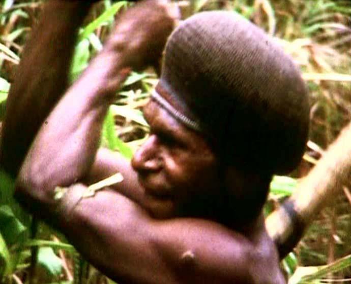 Film van pater Jules Camps OFM, opgenomen in de jaren '70 in zijn werkterrein in het bergland van Irian Jaya. Beelden van het slijpen van een bijlsteen en het omhakken van een boom.