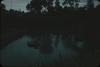 Man met vlot bezig in plas, westerse woningen op achtergrond. |