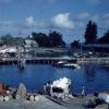 Kleine haven met boot, vaten op kade |
