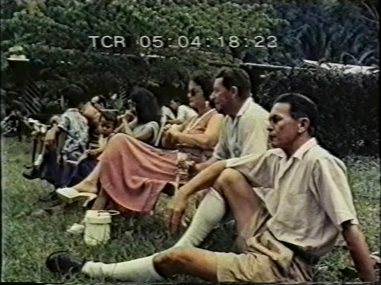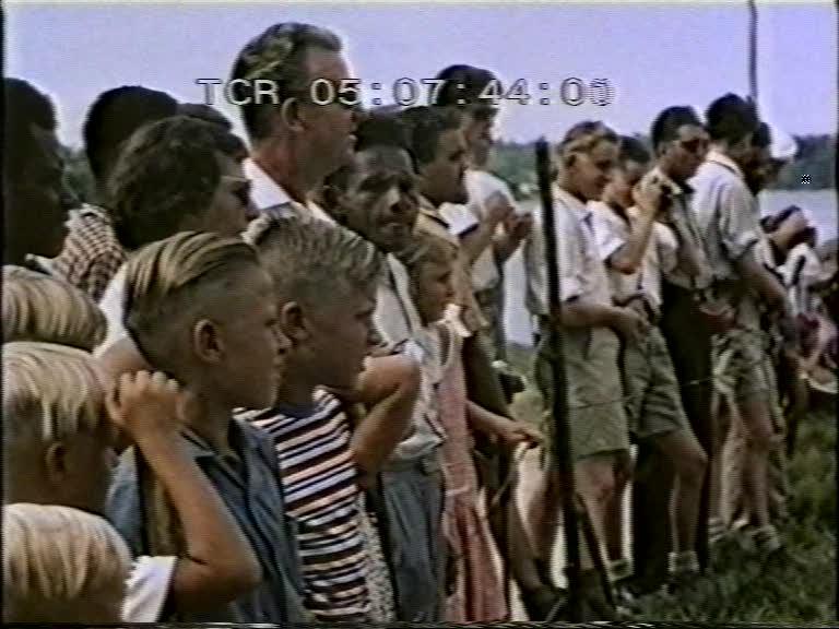 Beschrijving (bron: www.beeldengeluid.nl) 00.20 Beeld: Jachthaven van Hollandia-Haven waarin op afgemeerde zeilboten jeugdige zeilers mast en giek prepareren, het zeil hijsen of zomaar met de voeten in het water hangen. 00.10 Seinvlaggen met de letters Y en P worden aan de vlaggemast gehesen. Jongen peddelt zijn zeilboot achterwaarts naar open water, publiek slaat de start gade. Botenveld in het eerste rak. 00.30 Meisje zittend in de kuip trekt fok en grootzeil aan, tweetal meisjes rondt een boei. Aanwijzingen met grote megafoon van de wal. Voor de wind zeilend bootje, boot van de Vrijheidsklasse rondt boei. 01.03 Nationale vlag geflankeer door beide lettervlaggen. Deelnemers testen zelfvervaardigde wedstrijdspeedboten. Deelnemer neemt op zijn knieën plaats in de smalle cockpit, motoren worden afgesteld en gestart. 01.33 Viertal boten jaagt over uitgezette baan op het Sentanimeer terwijl wedstrijdleiding met een kijker de boten volgt en de tijd registreert met stopwatches. 02.09 Boot passeert de finsih waarbij zwart-wit geblokte finishvlag neergaat en de boot in een scherpe bocht uitloopt. 02.22 Jeugdige toeschouwers in dekstoelen. 02.28 Waterskieer start achterstevoren, draait zich dan een paar keer om en om en schopt zijn linkerski uit. 02.55 Op de gebruinde rug gezien: start van een waterskieër voor een slalom. 03.02 Tweetal meisjes doet zich tegoed aan vruchten, start van jongen en meisje, die vervolgens op een paar ski's acrobatische toeren tonen, gadegeslagen door het publiek op de wal. 03.45 Tweetal waaiert naar buiten en weer terug naar de hekgolf en bereikt steiger waar zij onder water gaan. 04.02 Speelplaats van scholencomplex waar kinderen een balspel spelen, limonade drinken, ringwerpen en zaklopen onder grote belangstelling van vriendjes en ouders. 05.00 Papoeajongen klimt in hoge mast, waaruit hij een opgerolde pajong haalt, die naar beneden gooit en dan zelf na afdalen begroet wordt door zijn supporters. 05.23 Geüniformeerde bestuursambtenaar lost met pistool startschot van estafette tussen Hollandia-Stad en Hollandia-Haven waarna lopers op weg gaan. Wisselpost op heuvelige weg waarlangs een deelnemer is gevallen 05.53 Finish waar Papoea-deelnemer als eerste onder groot enthousiasme arriveert 06.01 Fotograaf aan de kant temidden van talrijk publiek dat opvoering van dansen door groep Kapaukoe's van de Wisselmeren gadeslaat. 06.23 Witbeschilderde en van langwerpige bongo's voorziene Papoeadansers voeren rythmische dans uit. 06.46 Twee vlerkprauwen met witbeschilderde Papoeadansers meren af aan de graswal waar vele belangstellenden wachten. Dansers waaronder een pijl-en-boog schutter voeren langdurige groepsdans uit waarbij zij zichzelf met bongo's begeleiden. 07.41 Dansers bewapend met lansen en getooid met lange pluim. 07.50 Papoeameisjes in rieten schortjes met daarboven witte bustehouders voeren een dans uit. 08.11 Andere dansgroep van uitsluitend mannen treedt op zichzelf begeleidend met bongo's. 08.33 Kringdans van Papoeadansers. 08.40 Blootvoetse dansbenen en in rood-zwarte voetbalkousen en bruine schoenen gestoken benen van de buurman. 08.43 Witbeschilderde, rode rokken dragende dansers. 08.55 In twee rijen dansend achter drager met Nederlandse vlag bewegen de dansers zich voort. 09.09 Dan weer in een enkele rij langs het publiek. 09.13 Groep houdt halt en buigt voor het publiek. 09.18 Kaart van Nieuw-Guinea waarop in witte letters de tekst : Uitgebracht door Rank Filmdistributors (Holland) N.V. 09.24 Tekst : Einde. Vignet van de Rijksvoorlichtingsdienst. 09.30 EINDE.