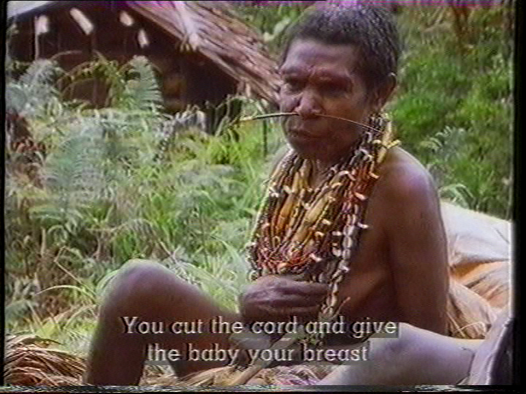 00.24 Tekst : De ontwikkeling van Nederlands Nieuw-Guinea Camera : A.A.Denninghoff-Stelling. Montage en Commentaar : Johan van Canstein. Spreker : Joop Reinboud. 00.39 Beeld : Landkaart van Nederlands Nieuw-Guinea waarin door animatie de overdwars lopende bergketens, met 'witte vlekken', zijnde de nog onbekende gebieden, de omringende oceaan en zeeën, de voornaamste steden, de grootste rivieren worden aangeduid. 03.05 Luchtopnamen van met oerbos begroeide bergketens, die hier en daar door een dik wolkendek priemen en van door dalen kronkelende rivieren. 03.50 Vloot van uit ruwe boomstammen vervaardigde prauwen, die door leden van de in het zuiden levende Asmat-stam staande in hoog tempo worden voortgeroeid. Vreugdedans van de in lendedoek geklede mannen, waarbij de dansers steeds op dezelfde plaats blijven, slechts hun knieen van elkaar bewegend. 04.25 Close-up van vrouw met draagnet om het hoofd. tweetal mannelijke Ekari's. Varkensfeest, een drietal gedode varkens terwijl een vierde op het houtvuur getild wordt. 3 inheemse vrouwen poseren. Het roosteren van het varken op hete stenen, begeleid door rondedans uitgevoerd door een dichte drom mannen met stoken en lansen, terwijl anderen voor de camera poseren of toekijken. 05.32 Smeulend daarna oplaaiend vuur waaraan zendeling zit, die dreigend met zgn. driftdans begroet wordt, afdaalt naar de groep stamleden, met de leider de knokkelgroet wisselt en overeenstemming bereikt. Orkestje van jongemannen met witgepleisterde gezichten, trommelend op smalle, langwerpige trommels. Springdans van jonge meisjes met wit bespikkelde gezichten. 06.11 Missionaris draagt openluchtmis op voor een eenvoudig altaar, waarbij de gehele bevolking achter hem staat opgesteld, dan in groepjes voor hem knielen en de Heilige Hostie ontvangen. 06.36 Draagstokken waaraan kokosnoten hangen, worden opgetild en in optocht naar feestterrein gedragen. Met spikkels beverfde inboorlingen leggen de kokosnoten op een open plek, steeds begeleid door jonge meisjes, die rhytmisch dansen op de muziek van de trommelaars. 07.15 Zendeling en zijn vrouw geven onderwijs aan gehurkt zittende, westers geklede, jonge mannen en vrouwen. Kennisoverdracht door een meisje en een jonge man aan individuele stamgenoot, waarbij eenvoudig leerboek gebruikt wordt. 07.50 Het dorp Enarotali, gelegen op een in de Wisselmeren afdalende heuvel. Op hun beurt wachtende Papoea's bij een in de open lucht gehouden polikliniek, waar een Europese dame bij een patient een oogverband aanlegt. Andere dame dirigeert zangkoor van tegen barak gezeten jongens en meisjes. 08.28 Ekari's trekken in grote getale ter kerke, waar inheemse geestelijke voorgaat in de dienst. Mannen egaliseren op hun hurken de bodem bij het aanleggen van een airstrip, waarna na voltooiing allen door de opzichters bijeen worden geroepen. 09.00 Nederlandse bestuursambtenaar schept met een kaurischelp blauwe kralen uit jutezak in een kartonnen doos. Naast hem liggen een hoop schelpen en metalen bijlen zonder steel. Hoofdnet dragende vrouwen. De ambtenaar betaalt een naar voren geroepen arbeider met een schelpvol kralen en overhandigt een ander ter betaling een bijl en een schelp, waarna uitgelaten menigte rondedans uitvoert. 09.43 Groepje stamgenoten betaalt elkaar met kralen. Jonge vrouw schudt oebi's (zoete aardappels) uit haar hoofdnet en krijgt betaling in kralen van de vrouw van de zendeling. Schoonmaken van de oebi's door bediende waarbij jongeren toekijken. 10.03 Omvertrekken van jonge bomen met behulp van zware, tussen twee bulldozers gespannen, ketting. Omduwen van tammen door bulldozers, die door Papoea's bestuurd worden. Zware bulldozer schuift omvangrijke hoop grond voor zich uit. Egaliseren van het talud met schoppen. Dragline dropt een volle bak grond op het talud. Graafmachine zwenkt volle bak rond en ledigt de inhoud in de laadbak van een kipper, die meteen wegrijdt. Kippers onderweg op reeds ten dele voltooide stukken weg. Landmeter achter zijn theodoliet. Kippers lossen hun lading. Wegenschaaf schaaft de bovenkant van de weg, die vervolgens door tankauto besproeid wordt en met stoomwals ingeklonken wordt, waarna de berm met bitumen besproeid wordt. 12.13 Overzicht van de aanleg van een sleephelling te Manokwari. Dozer verschuift hoeveelheid koraalpuin, dat door dragline op GMC geladen wordt. De helling in aanleg. Voor montage gereedliggende portalen en overspanningen. Met golfplaten gedekte betonloodsen. Een werfkraan, die zware scheepsonderdelen ter plekke neerlaat. Een sleepboot, waarvan de kiel gelast wordt. Werfarbeider demonteert drukmeters van een gasfles, arbeiders demonteren een scheepsschroef. Overzicht van de werf. 14.02 Houthakkers, kappen, staande op een stellage rond een onderstam, grote wig in boom, die even later met veel geraas ter aarde stort, jonge stammen in zijn val meeslepend. Uitslepen van de stam uit het oerwoud naar de verzamelplaats aan de kust, hangend in een achter een dozer getrokken mallejan op rupsbanden. Afkorten van de stam in verscheepbare afmetingen met kettingzaag. Bulldozer sleept een boomstam opzij, en schuift hem op het dek van een ponton. 16.24 Zagers lopen met de kettingzaag over een stam. Zagen van een onderstam in dikke plakken door een horizontale kettingzaag. Oplatten van het hout door drooglatten tussen de plakken te slaan. 16.41 Aanbrengen van een aftapgleuf in een stam, waardoor hars druipt, dat zich aan de voet van de stam ophoopt en in brokken in een jutezak gestopt wordt. Papoea's dragen zakken met hars (kopal) uit een loods naar buiten. Dichtnaaien van een zak met naald en draad. De zakken worden naar het strand gedragen, waar kustvaartuig voor anker ligt en sloep te water laat. Het strand gezien vanaf het vaartuig. De sloep wordt naar het strand geroeid tegemoet gelopen door dragers met zakken kopal. Een tweeromps roeiprauw langszij het kustvaartuig. De zakken worden in de sloep geladen, een vlerkprauw glijdt voorbij. Bemanningslid van de kustvaarder bedient de winch, een and